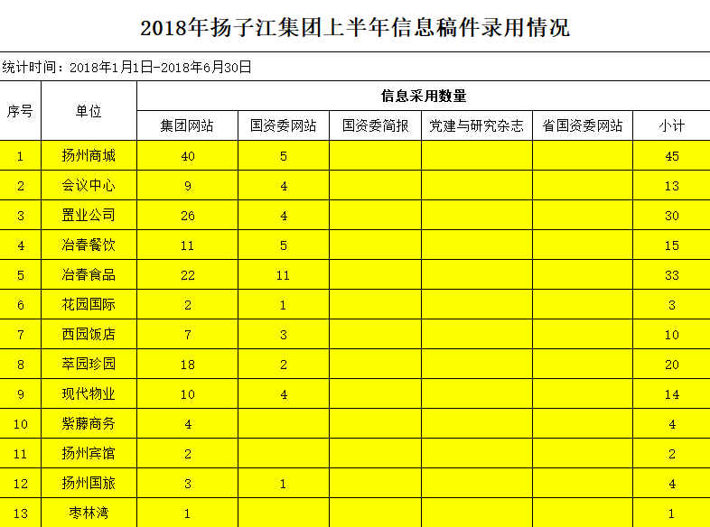 2018年二季度,市國(guó)資委共采用集團(tuán)信息稿件60篇,在14家市屬?lài)?guó)企里排名第一(一季度采用33篇,排名第三。上半年共采用93篇,排名第二)。這是各單位及集團(tuán)各部門(mén)高度重視、積極寫(xiě)稿投稿、共同努力的結(jié)果。現(xiàn)將揚(yáng)子江集團(tuán)2018年上半年信息稿件采用情況統(tǒng)計(jì)如下,望各單位及集團(tuán)各部門(mén)下半年繼續(xù)挖掘工作亮點(diǎn)、撰寫(xiě)報(bào)送信息、共同完成宣傳工作,并在保證數(shù)量的同時(shí)提高稿件質(zhì)量。